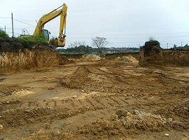 バックホーンで原料を採掘してダンプに積込み、原料ハウスへ運搬します。