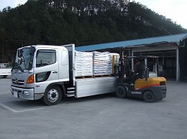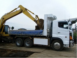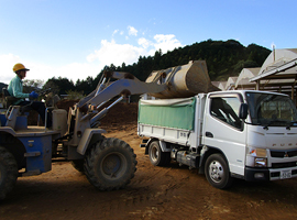 乾燥した赤玉土をダンプに積込、工場に運びます。