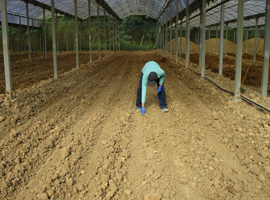 赤玉土をハウス内に広げて乾燥させます。