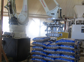 赤玉土の製品をロボットがパレットに積みます。